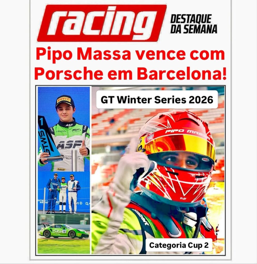 Que início de carreira! Após estrear com pole position e duas vitórias na etapa de abertura da Porsche Carrera Cup Rookie na Porsche Cup Brasil, Pipo Massa, que é filho do piloto Felipe Massa, segue escrevendo uma boa história nos seus primeiros quilômetros como piloto profissional. Ele venceu a primeira corrida da etapa de Barcelona, no Circuito da Catalunha, do GT Winter Series 2026, na categoria Cup 2. Os primeiros treinos foram em pista seca mas no dia do treino classificatório e da primeira corrida do fim de semana, choveu. Nada que intimidasse o jovem de 16 anos, que largou em segundo e venceu pela terceira vez em três corridas disputadas na curta carreira profissional até aquele momento, numa batalha acirrada contra o sueco Anders Steiner.